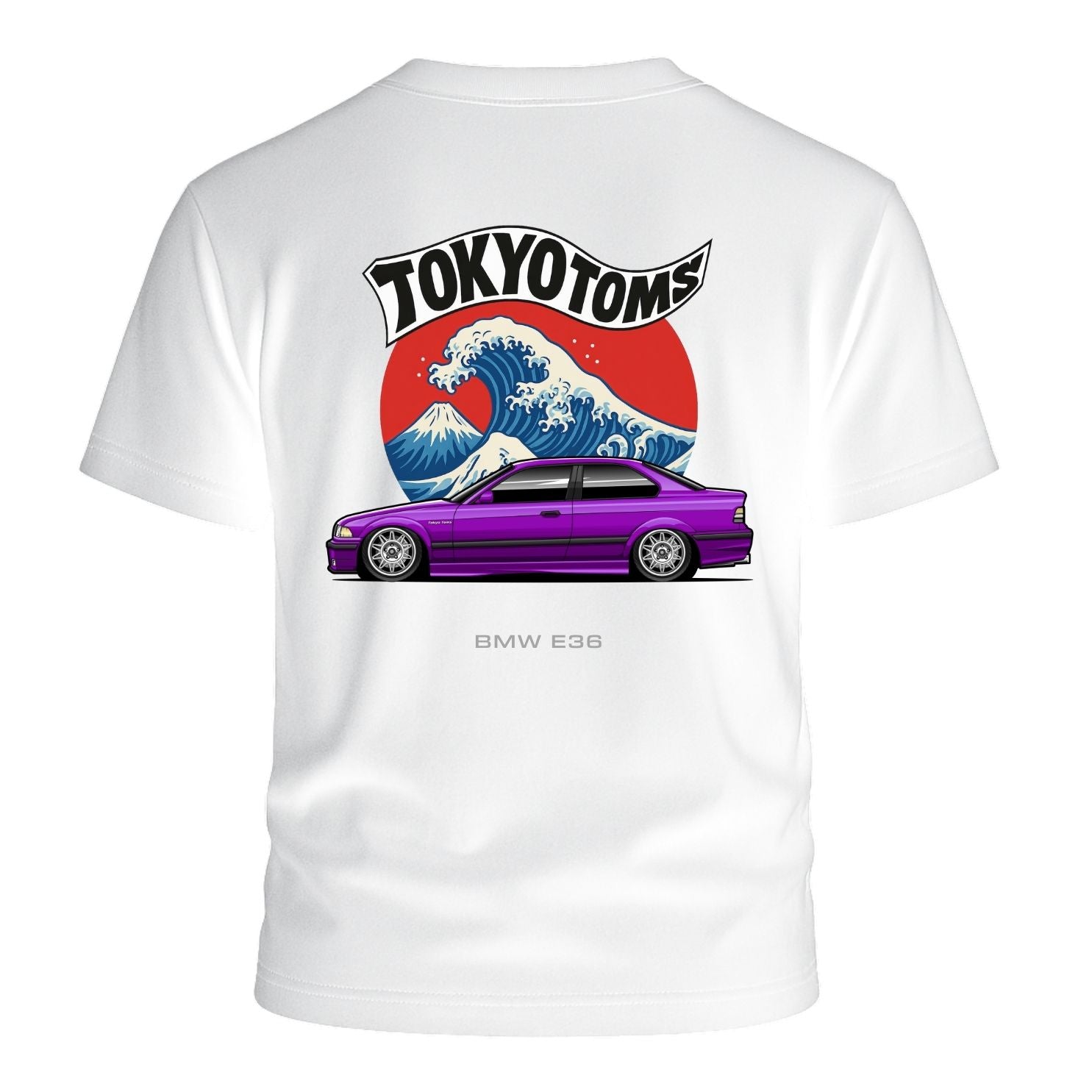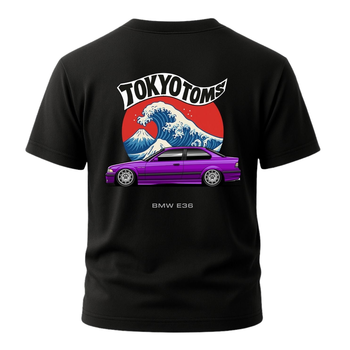 Celebrate JDM heritage with the Tokyo Toms BMW E36 Wave T-Shirt. Featuring a bold BMW E36 set against Japan’s iconic Great Wave and rising sun backdrop, this shirt pays tribute to the 90s coupe blending smooth power with European handling. The “Tokyo Toms” logo arches proudly above, with the tagline Fueled by Passion, Born in Tokyo underscoring the design.
