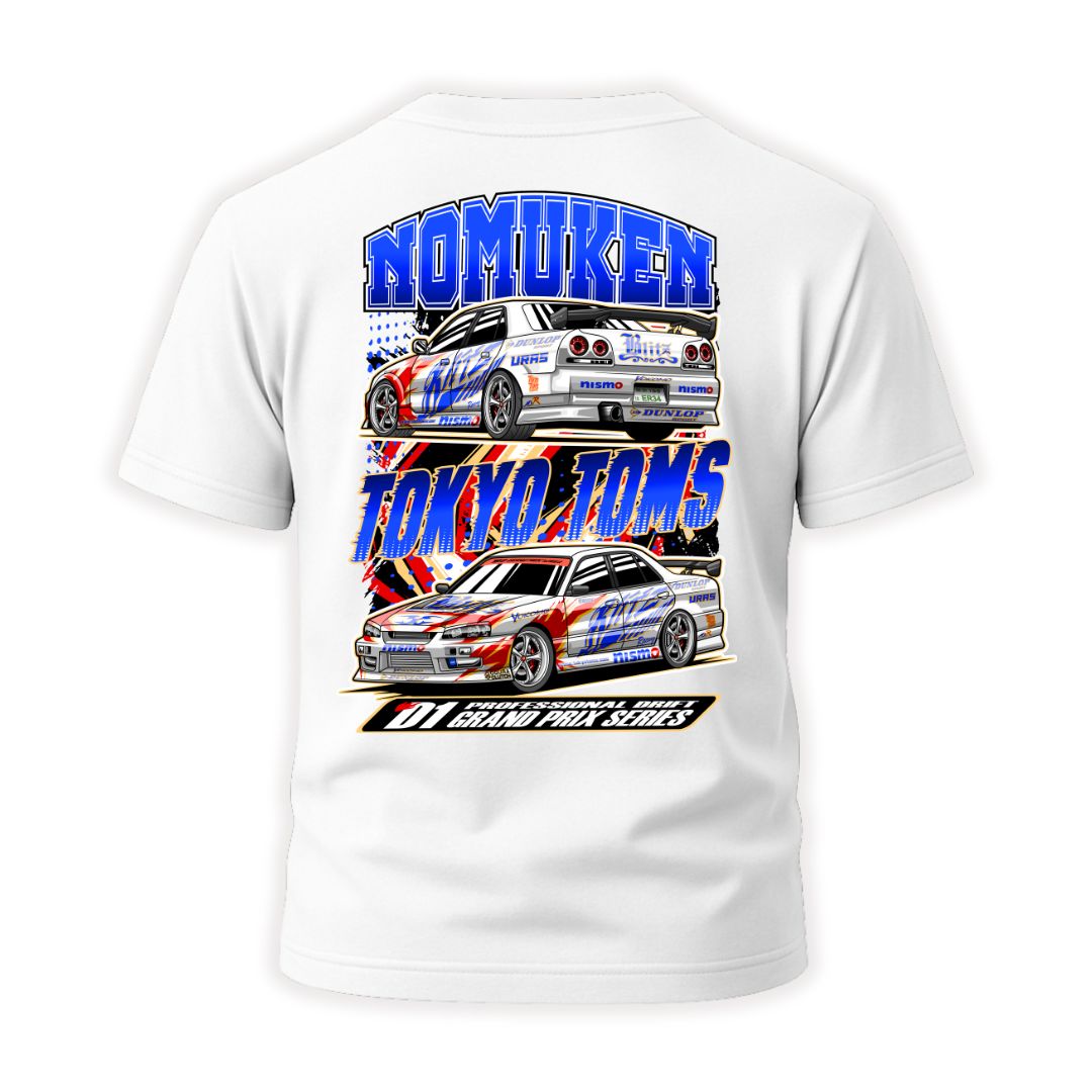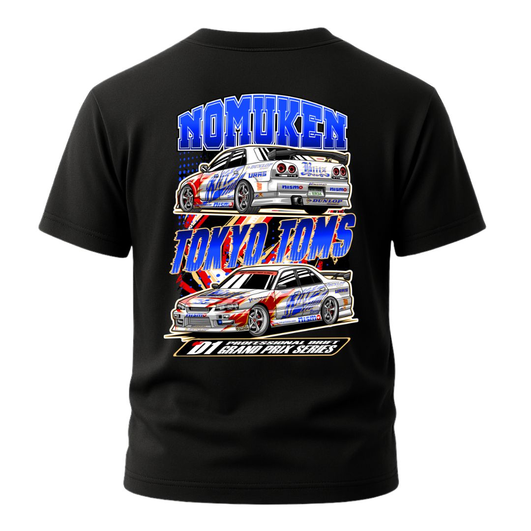 Unleash the power of D1 legends with the Tokyo Toms Nomuken D1 GP Skyline T-Shirt. Featuring the iconic Blitz R34 and ER34 Skylines piloted by drift legend Ken “Nomuken” Nomura, this design pays tribute to one of the most recognisable liveries in Japanese drift history.