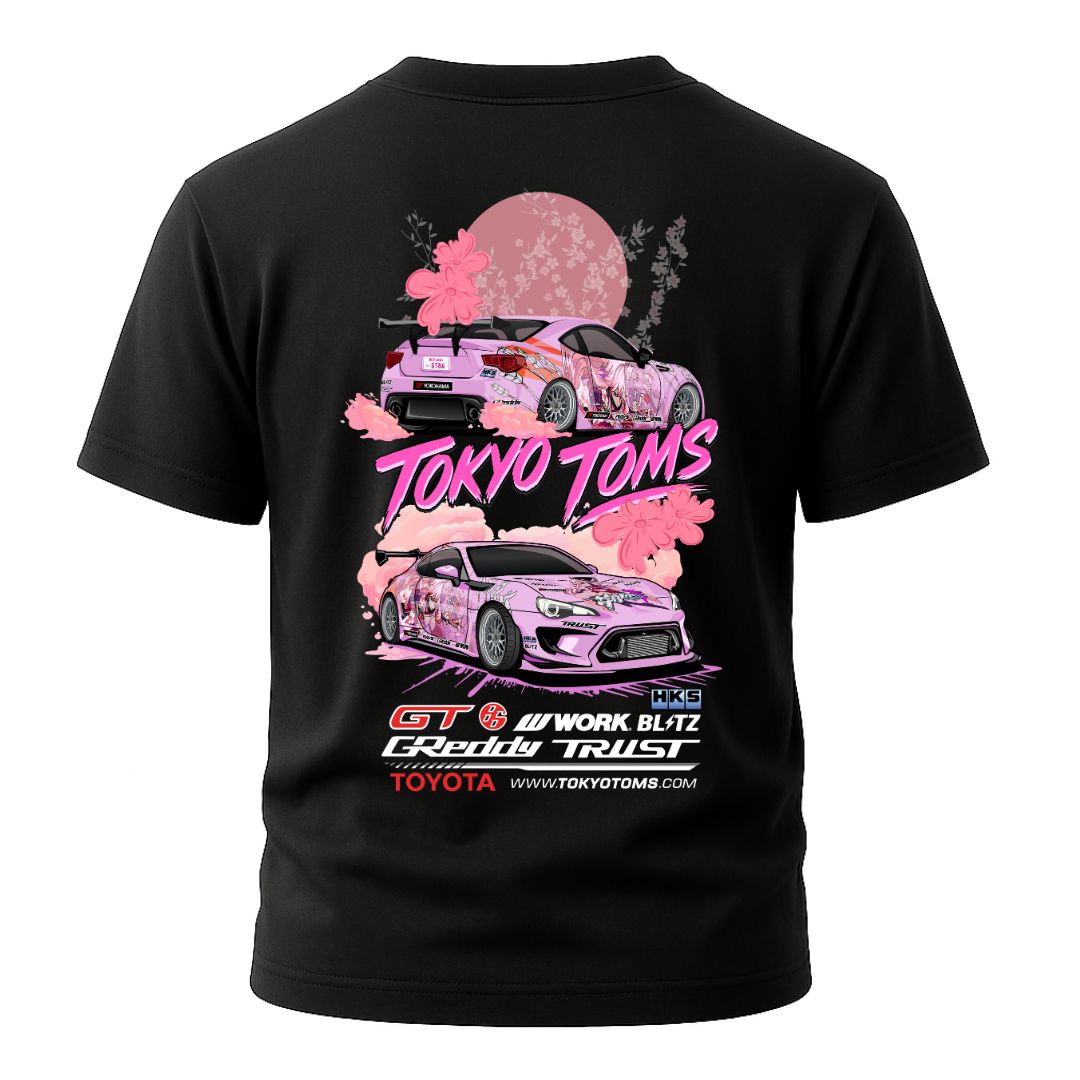 The design pops with cherry blossoms, bold Tokyo Toms typography, and sponsor details from classic JDM brands like HKS, Blitz, Greddy, and Work Wheels, creating the perfect mix of show-car energy and drift-garage spirit.
