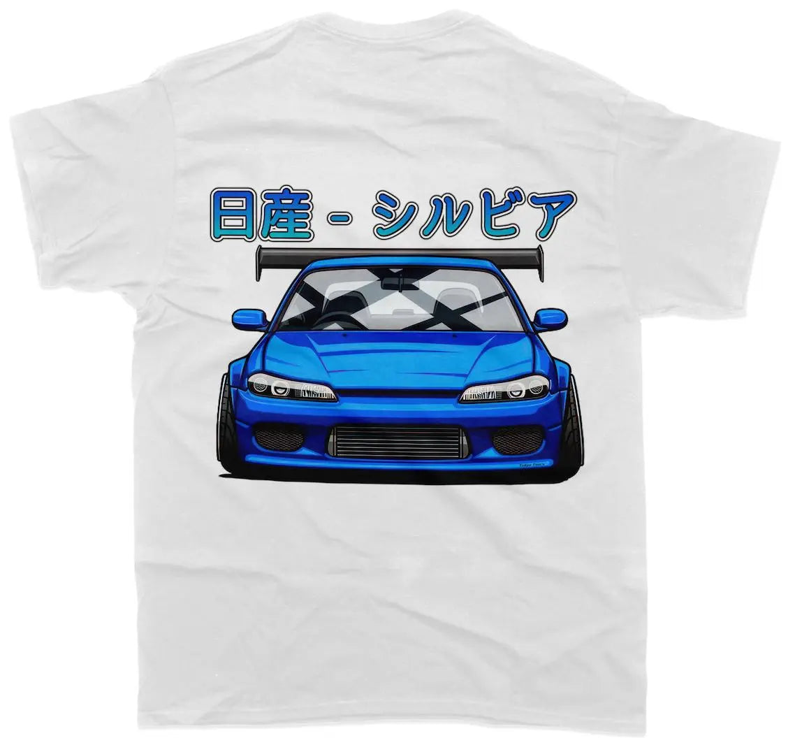 The design features a captivating graphic showcasing the distinctive silhouette of the Nissan Silvia S15, capturing the essence of its sleek lines and dynamic presence. From its aggressive front end to its iconic rear wing, this shirt pays homage to the legacy of one of Nissan's most beloved models.