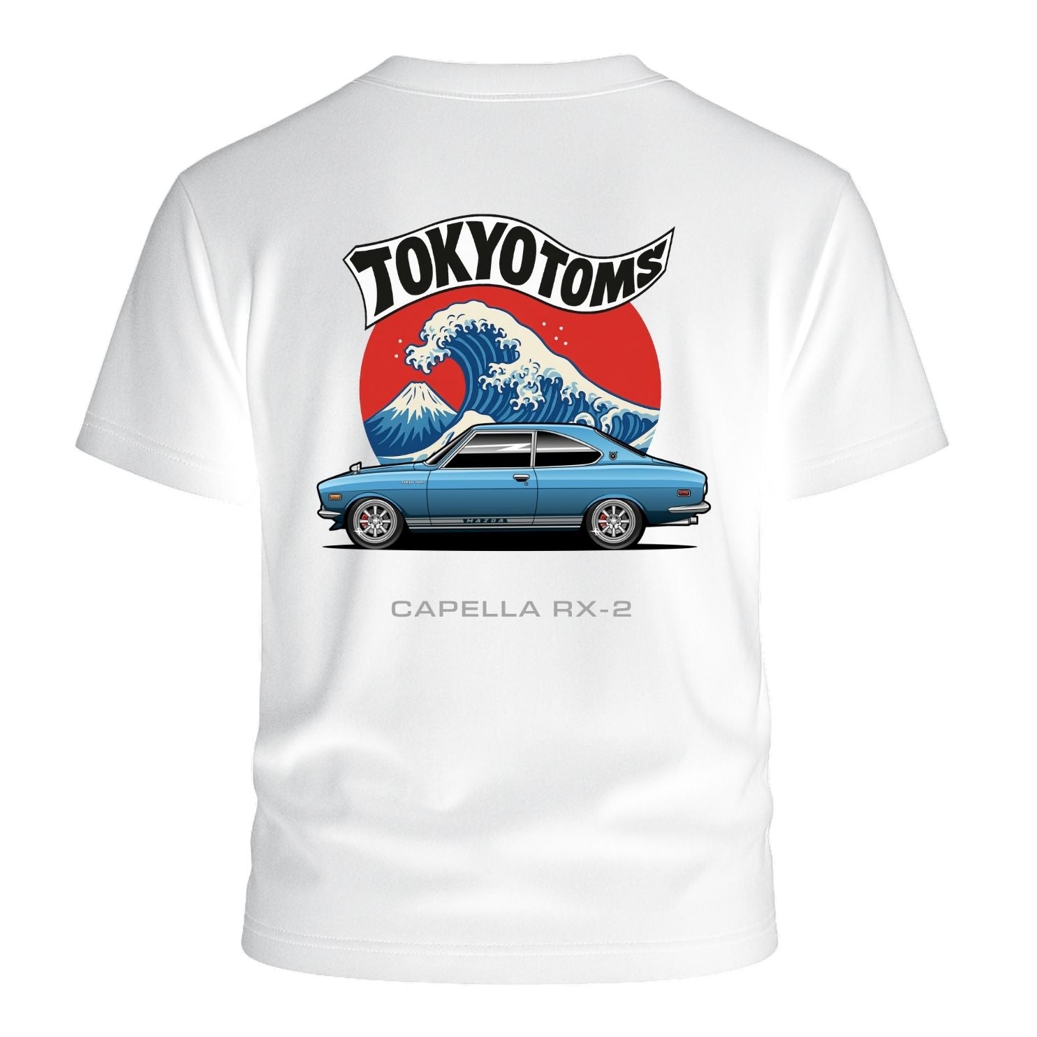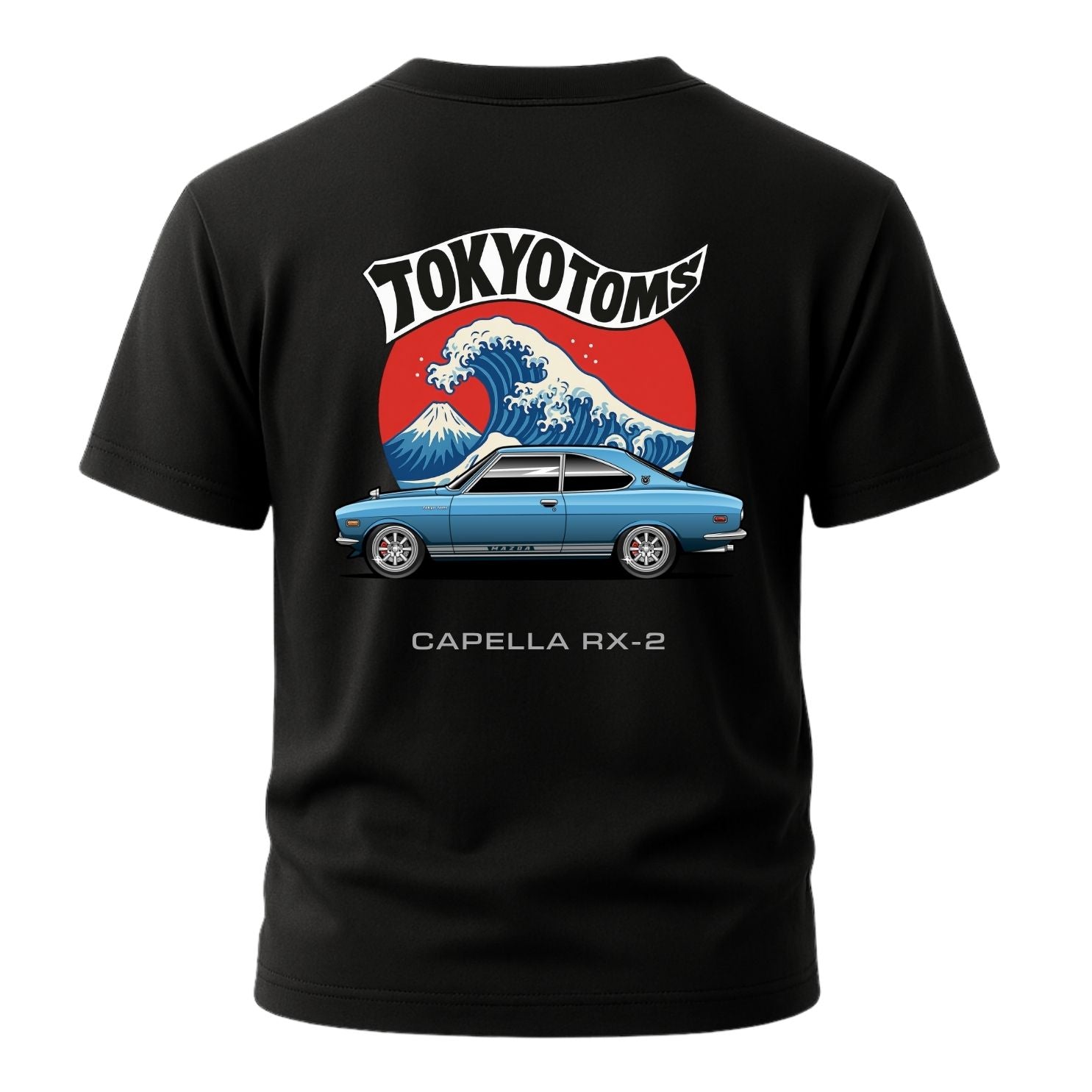 Celebrate JDM heritage with the Tokyo Toms Mazda RX-2 Wave T-Shirt. Featuring a bold Mazda RX-2 set against Japan’s iconic Great Wave and rising sun backdrop, this shirt pays tribute to the early rotary sedan/coupe that set the stage. The “Tokyo Toms” logo arches proudly above, with the tagline Fueled by Passion, Born in Tokyo underscoring the design.