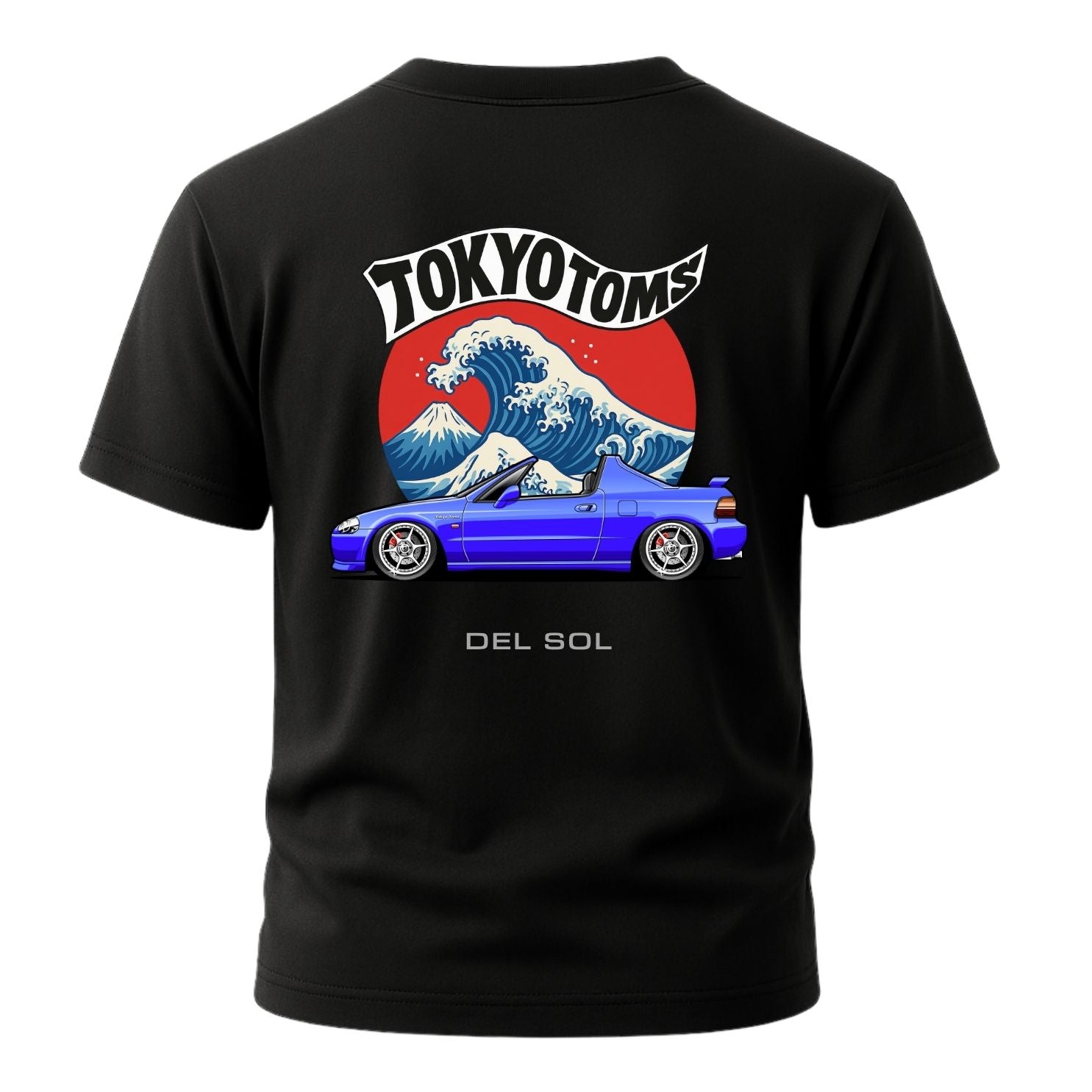 Celebrate JDM heritage with the Tokyo Toms Honda Del Sol Wave T-Shirt. Featuring a bold Honda Del Sol set against Japan’s iconic Great Wave and rising sun backdrop, this shirt pays tribute to the quirky 90s targa‑top Civic spin‑off with JDM charm. The “Tokyo Toms” logo arches proudly above, with the tagline Fueled by Passion, Born in Tokyo underscoring the design.