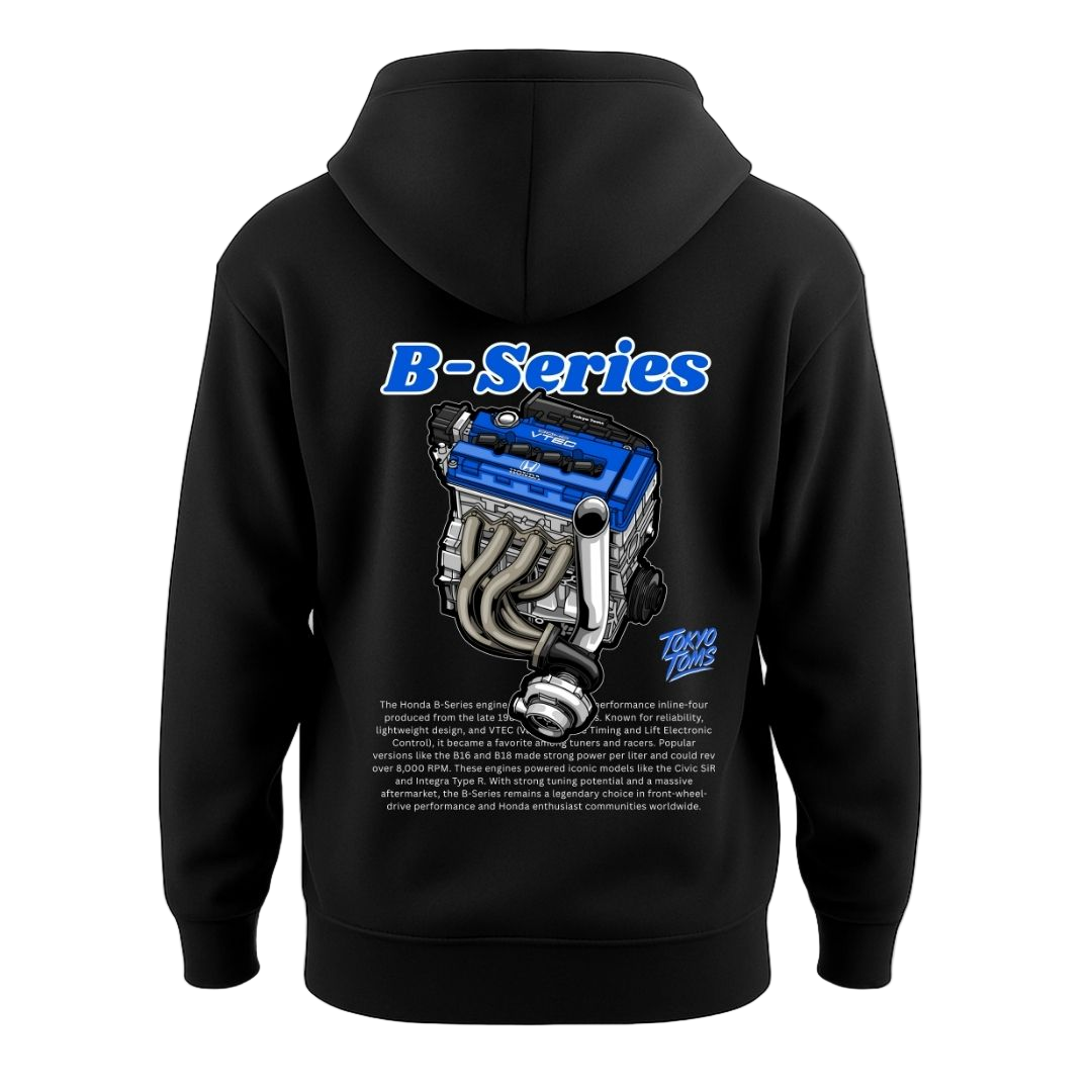 This premium unisex pullover features a bold back print of the legendary B-Series engine — the heart of countless EG, EK, and DC builds — illustrated in crisp, vibrant detail for true VTEC enthusiasts.